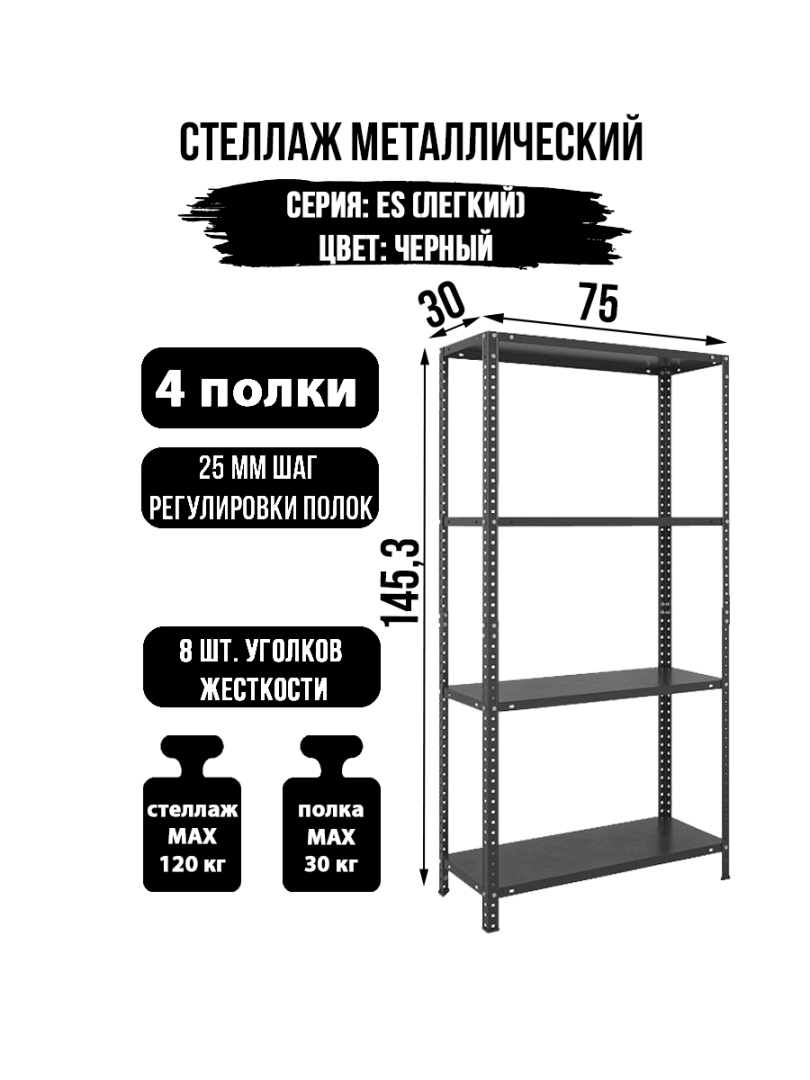 Стеллаж металлический для хранения ES 150KD 1453*750х300 мм 4 полки, цвет: черный